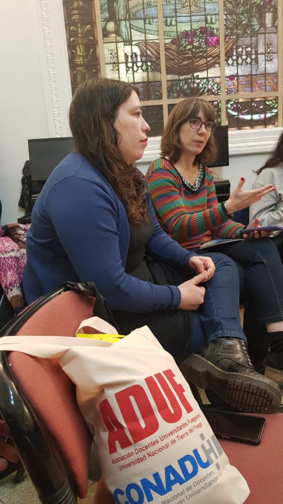 Laura Kniznik y Ayelén Martínez, por la Dirección, estamos intercambiando reflexiones en los diferentes ejes planteados (Violencia, Cuidados, Diversidad y Transversalización de la perspectiva de género), donde se presentan experiencias de gestión, docencia, extensión e investigación, con nuestra particularidad de hacerlo desde una organización sindical.
